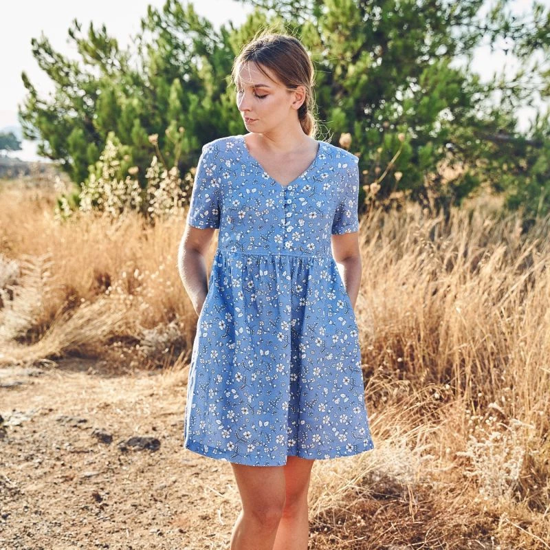 Short-sleeved Mini Dress With V Neck And Buttons – Regatta By Haris Cotton